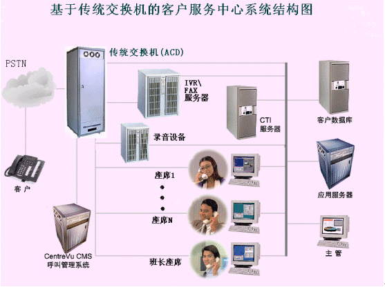 但是由于傳統(tǒng)交換機在語音資源、傳真資源等呼叫中心基本信息資源處理能力方面的匱乏,必須通過語音板卡和PC機的方式解決,有時因為系統(tǒng)容量大,甚至需要多臺共同服務,其IVR(交互式語音應答)和FAX、CTI服務器卻只能達到PC機標準。所以開發(fā)出的系統(tǒng)雖然前置交換為電信級的標標準,但是其整體性能、穩(wěn)定性仍受PC插卡方式的影響。另外,由于交換機和IVR、FAX、CTI等之間的相互連接會受其密合程度和其他外來因素影響,會造成一些不可預知的系統(tǒng)故障。不僅交換機+CTI服務器+IVR服務器(語音板卡+PC機)+傳真服務器(傳真卡+PC機)+錄音模塊設備(監(jiān)控錄音卡+PC機)的建設成本非常高,并且編程開發(fā)較復雜。