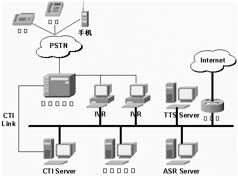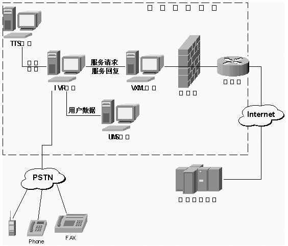 TTS系統(tǒng)、VXML系統(tǒng)、UMS系統(tǒng)與已有IVR(電話語(yǔ)音自動(dòng)應(yīng)答系統(tǒng))平臺(tái)、Internet、PSTN結(jié)合的示示意圖如下:
