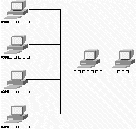 在數(shù)據(jù)中心設(shè)置VXML服務(wù)器,提供訪問互聯(lián)網(wǎng)絡(luò)的接口,地市臺(tái)與中心服務(wù)器使用標(biāo)準(zhǔn)的基于應(yīng)用層的協(xié)議通訊。地市臺(tái)與數(shù)據(jù)中心交換網(wǎng)頁(yè)和其他數(shù)據(jù),這種交換是實(shí)時(shí)的。各地市的電話用戶就能利用運(yùn)營(yíng)商提供本地電話號(hào)碼訪問互聯(lián)網(wǎng)上的信息。