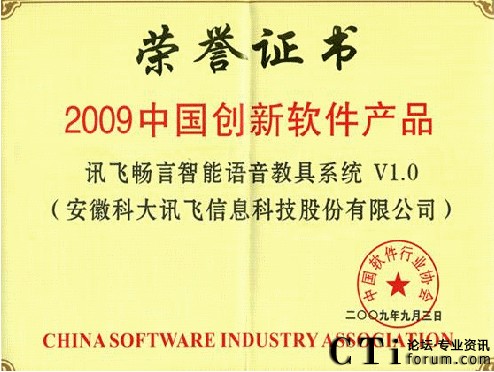 CTI論壇(ctiforum)9月8日消息:日前,訊飛暢言語音教具系統(tǒng)榮獲“2009中國創(chuàng)新軟件產品”。