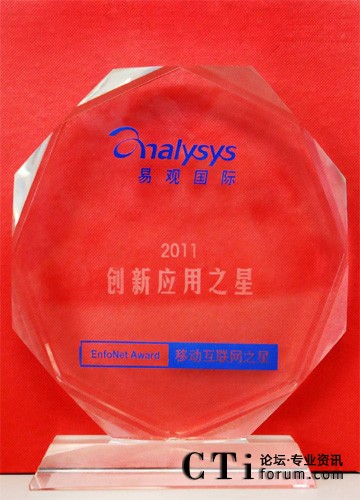 易觀國際成立于2000年,是中國信息化、互聯(lián)網(wǎng)和新媒體以及電信運(yùn)營(yíng)行業(yè)規(guī)模最大的中國科技市場(chǎng)領(lǐng)先的研究和咨詢機(jī)構(gòu)。2011易觀“EnfoNet Award–移動(dòng)互聯(lián)網(wǎng)之星”評(píng)選是易觀年度產(chǎn)業(yè)盛會(huì)——首屆移動(dòng)互聯(lián)網(wǎng)博覽會(huì)暨第四屆易觀移動(dòng)互聯(lián)網(wǎng)年會(huì)的重要組成部分,是易觀國際(Analysys International)為推薦中國互聯(lián)網(wǎng)及移動(dòng)互聯(lián)網(wǎng)產(chǎn)業(yè)中表現(xiàn)優(yōu)異且具備發(fā)展?jié)摿Φ钠脚_(tái)及應(yīng)用而設(shè)立。