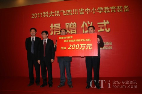 CTI論壇(ctiforum)11月11日消息(記者 潘婷婷): 2011年11月10日,科大訊飛在成都嬌子國際會(huì)議中心舉行了隆重的捐贈(zèng)儀式,向四川省各市、地州中小學(xué)捐贈(zèng)了價(jià)值200萬元的暢言系列教學(xué)產(chǎn)品。會(huì)議由四川省教育廳技術(shù)物資裝備處處長張生主持,四川省教育廳副廳長張林祥、科大訊飛副總裁徐玉林在儀式上致辭,來自各市、地州教育主管部門領(lǐng)導(dǎo)、各縣區(qū)教育局負(fù)責(zé)人、受贈(zèng)學(xué)校教師代表,以及相關(guān)媒體共100多人等參加了捐贈(zèng)儀式。
