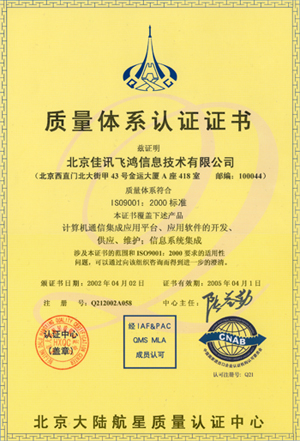 經(jīng)過近半年時間的建立和保持質(zhì)量體系運行,佳訊飛鴻于在2002年3月順利的通過為期三天的嚴格審核,并重點對佳訊公司核心技術的CTI平臺進行審核。2002年4月2日通過了ISO國際組織的新體系標準ISO9001:2000的體系認證,取得了通過該標準的認證證書。佳訊飛鴻公司也成為國內(nèi)第一家對CTI平臺進行審核并通過認證的公司。其完成標志著公司從成立之時起即嚴格遵循國際企業(yè)標準及現(xiàn)代企業(yè)管理模式,以軟件產(chǎn)品質(zhì)量管理體系為載體,以客戶需求為導向。全面提高產(chǎn)品、服務質(zhì)量,順應不斷變化的技術發(fā)展方向和市場變化,在質(zhì)量、技術、成本和交期等方面全力滿足客戶需求,為客戶提供最佳性價比的產(chǎn)品和服務。