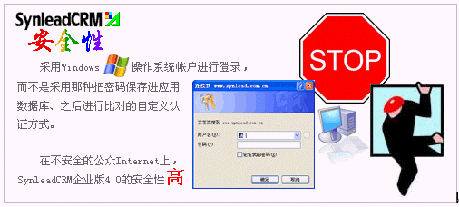 SynleadCRM企業(yè)版4.0采用了高度捆扎操作系統(tǒng)安全性的域帳戶認證,而不是在應用層面自定義用戶認證策略。事實上,SynleadCRM從一開始就基于這種安全機制并且不斷完善,以避免今后無法向更高端邁進。