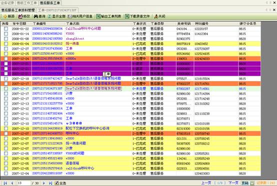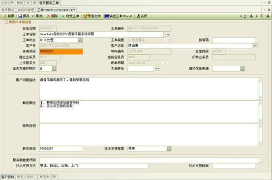 3) 工作流閉環(huán)、客戶通話歷史,客戶聯(lián)系歷史,工單流轉(zhuǎn):工作流系統(tǒng)是通過工單實(shí)現(xiàn)各工作流環(huán)節(jié)的聯(lián)系以及工作流的定義管理,工作流狀態(tài)查詢、更改的。操作員可根據(jù)用戶的不同業(yè)務(wù)請求,建立相應(yīng)的工單記錄,并對該事后處理過程進(jìn)行跟蹤;也可對要處理的事務(wù)形成工單轉(zhuǎn)給相應(yīng)的操作員,并跟蹤該工單的處理過程;可定期提示操作員處理要過期的工單,以提高服務(wù)質(zhì)量;每次處理過程都會(huì)有詳細(xì)的記錄,以便統(tǒng)計(jì)查詢 。如圖8、9、10: