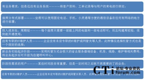 基于云計(jì)算(400+Saas)的ToneThink強(qiáng)訊托管型呼叫中心采用世界最先進(jìn)的呼叫中心核心技術(shù),企業(yè)無需投入任何軟件、硬件,即可根據(jù)業(yè)務(wù)需求立刻擁有一套自己的呼叫中心系統(tǒng),獲得呼入式、呼出式營(yíng)銷服務(wù)帶來的超值回報(bào)。那么什么情況下您適合選用托管型的呼叫中心呢?
