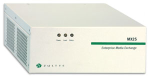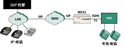 MX25 是一種能夠在兩種不同模式下工作的模塊化設備。在其中一種工作模式下,MX25 是一個通向 PSTN 網(wǎng)關的獨立 SIP。當在這種模式下工作時,MX25 轉(zhuǎn)換電話呼叫的格式,使其可以在 IP 網(wǎng)絡與公用電話網(wǎng)絡之間傳遞。另一種工作模式是,將 MX25 作為 MX250 的功能延伸系統(tǒng),用于不超過 25 個用戶的分支辦公室。在這種配置下,MX25 與 MX250 通信并交換有關用戶和設備的信息。即使連接 MX250 和 MX25 的 WAN 鏈路出現(xiàn)故障,MX25 也能繼續(xù)工作并處理來自/發(fā)往 PSTN 的傳入/傳出呼叫。