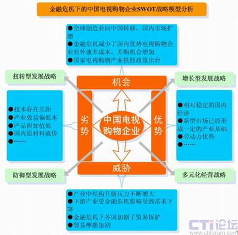 1992年至2009年以來,電視購物經(jīng)歷了從割據(jù)到統(tǒng)一,全國購物頻道網(wǎng)絡(luò)化;從粗放到科學(xué),頻道運營模式專業(yè)化;從簡介到深度,頻道編排方式規(guī)律化、從滯后到及時,物流配送體系成熟化。電視購物被譽為繼零售、超市之后的第三次銷售革命,電視購物將成為金融危機經(jīng)濟形態(tài)下未來中國電視新的經(jīng)濟增長點,而付費電視、數(shù)字網(wǎng)絡(luò)電視的發(fā)展,是中國電視購物市場新的戰(zhàn)略機會。金融危機下的中國電視購物企業(yè)SWOT戰(zhàn)略模型分析如下: