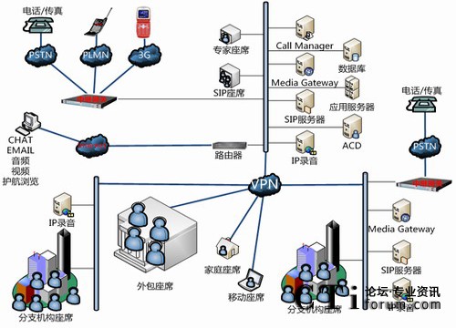分布接入、分布座席、集中管理:由獨(dú)立接入、獨(dú)立座席的多個(gè)子系統(tǒng)組成一個(gè)完整系統(tǒng)。接入、座席、IVR/FAX 分布,但系統(tǒng)可統(tǒng)一處理、統(tǒng)一監(jiān)控、統(tǒng)一管理。