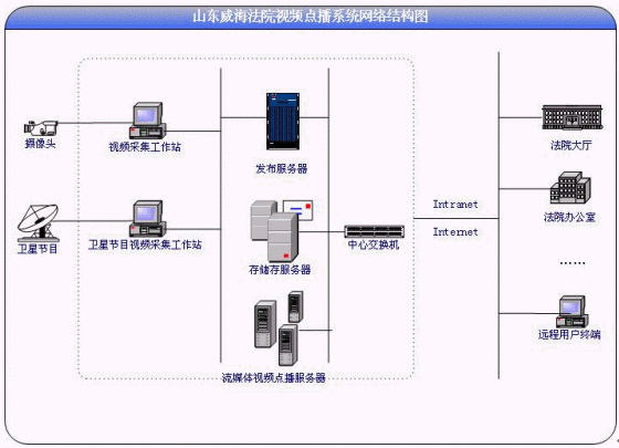 威海中級人民法院VOD應(yīng)用建設(shè)包括:用戶認證系統(tǒng)、遠程上傳系統(tǒng)、內(nèi)容分發(fā)系統(tǒng)、內(nèi)容播放系統(tǒng)(流媒體)、網(wǎng)站內(nèi)容系統(tǒng)等部分。