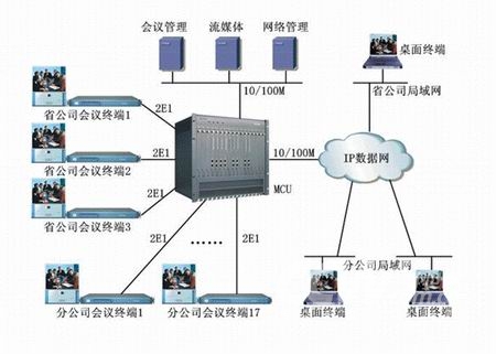 該系統(tǒng)基于蘇州科達公司KDV系列視頻會議產(chǎn)品,全網(wǎng)采用1套MCU、20套會議室型終端和200多套桌面型終端,其中會議室型終端通過2條E1線路捆綁與MCU相連、桌面型終端通過10/100M以太網(wǎng)和IP數(shù)據(jù)網(wǎng)與MCU相連。總體網(wǎng)絡(luò)結(jié)構(gòu)如下圖所示: