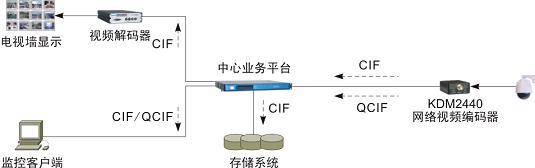 KDM2440/2440P集成了雙碼流功能,可對單路模擬視頻進(jìn)行CIF和QCIF兩種格式的同時編碼上傳,并由中心業(yè)務(wù)平臺進(jìn)行差異化轉(zhuǎn)發(fā)。比如,視頻解碼器和錄像存儲單元接收CIF視頻,可實現(xiàn)較高清晰度的圖像顯示和存儲,而客戶端接收QCIF視頻,可有效降低PC資源的消耗,從而保證客戶端在進(jìn)行多畫面視頻實時瀏覽時的應(yīng)用效果。