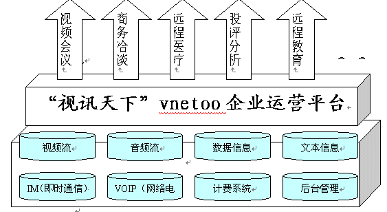 VNETOO視訊運營平臺具有強(qiáng)大的數(shù)據(jù)功能和優(yōu)質(zhì)的音視頻效果,是集"視頻+語音+數(shù)據(jù)+IM(即時通信)+VOIP(網(wǎng)絡(luò)電話)+計費+后臺管理"的基于IP網(wǎng)絡(luò)世界一流視訊服務(wù)提供平臺,它革命性地開創(chuàng)了視訊運營領(lǐng)域的全新模式。(見圖表一:"視訊天下"vnetoo運營平臺結(jié)構(gòu))。