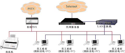 某中小企業(yè),無分支機構(gòu),現(xiàn)時有一個由傳統(tǒng)PBX構(gòu)建的電話系統(tǒng)和一個以太局域網(wǎng),兩者相互獨立,局域網(wǎng)通過一臺代理服務器用以太網(wǎng)或ADSL方式接入Internet。企業(yè)的語音通信由電話系統(tǒng)實現(xiàn);員工的日常工作需要使用計算機以及多種局域網(wǎng)和Internet服務。
