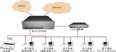 - 用單個RT-CCP1000取代原有系統(tǒng)的傳統(tǒng)PBX和代理服務器,提供電話系統(tǒng)功能和Internet接入。