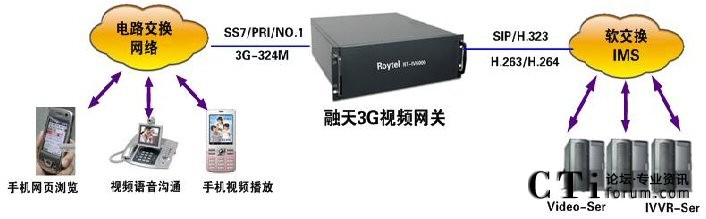 融天科技RT-IV6000硬件平臺非常簡單,通過E1或PRI與3G的移動交換機MSC相連接,實現(xiàn)3G網(wǎng)絡(luò)與IP的對接。從而提供3G用戶、SIP用戶、H.323用戶或其他用戶訪問視訊業(yè)務(wù)。接入部分保證了視訊平臺與移動網(wǎng)絡(luò)的順利接入以及與其