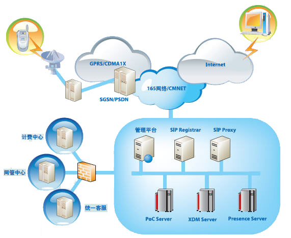 POC(Push-to-talk Over Cellular)是基于蜂窩移動通信網(wǎng)絡的PTT(Push To Talk)業(yè)務。POC通過半雙工VoIP技術來實現(xiàn)PTT,利用GPRS或CDMA1X等網(wǎng)絡“永遠在線”的優(yōu)勢,節(jié)省運營成本,同時為傳統(tǒng)移動用戶提供全新的業(yè)務形式。在支持GPRS/CDMA1X網(wǎng)絡的同時,東信北郵手機一鍵通平臺系統(tǒng)亦支持IMS網(wǎng)絡。