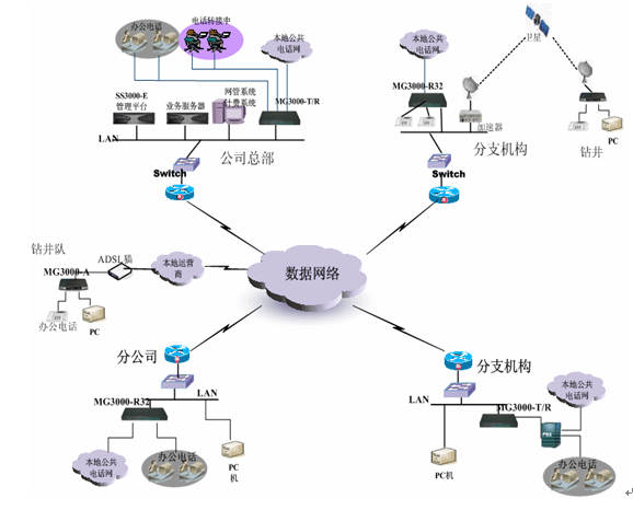 對規(guī)模比較小的辦事處,或者遠(yuǎn)端的鉆井隊,一般在本地都是采用ADSL接入這樣方式,這樣情況可以直接配置MG3000-A語音往關(guān),實現(xiàn)語音數(shù)據(jù)同傳方式。MG3000-A提供1、4、8口多種方式供實際情況來選擇。所有的號碼可以直接在總部中心的平臺來分配控制。