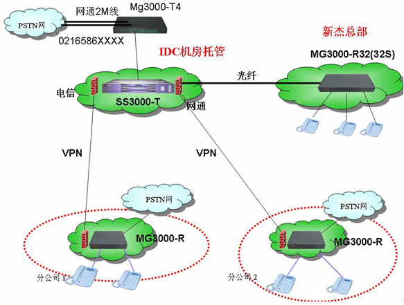 - 各地全部采用MG3000-R,通過VPN注冊到軟交換平臺(tái)上,S口接普通電話,O口接原來的模擬線,整個(gè)系統(tǒng)通過各地-R的O口實(shí)現(xiàn)長途落地的功能。