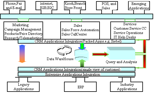 傳統(tǒng)的數(shù)據(jù)庫及中間件軟件廠商,都能提供一些“point solution”(指基于某一單獨(dú)技術(shù)領(lǐng)域),例如,單獨(dú)的客戶服務(wù)CallCenter方案,數(shù)據(jù)倉(cāng)庫/商業(yè)智能BI解決方案。Compaq向客戶提供的是完整的CRM方案套件,其技術(shù)組成主要包括前端的基于多種接觸媒體(phone,fax,email,web)CallCenter;核心部分的Sales Force Automation,Marketing Automation,Service Operation;以及后端的DataWareHouse/BI,ERP及原有集成應(yīng)用系統(tǒng)(Legacy Application)的集成等部分。通過下圖我們將詳細(xì)描述康柏的整體CRM方案框架及其解決方案: