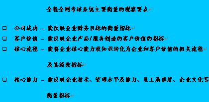 通過定義簡單明確的核心流程目標(biāo)將客戶滿意為核心流程緊密且巧妙地連結(jié)在一起,向我們呈現(xiàn)有效的全程全網(wǎng)考核策略目標(biāo)因果關(guān)系。