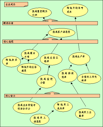 全程全網(wǎng)考核策略目標(biāo)因果關(guān)系圖是"平衡計分卡"應(yīng)用的重要環(huán)節(jié),在此要特別強(qiáng)調(diào)?因為它是將根據(jù)公司遠(yuǎn)景規(guī)劃以及使命確定的四個考核維度轉(zhuǎn)化為全程全網(wǎng)考核系統(tǒng)進(jìn)入實際操作階段之關(guān)鍵步驟。在平衡記分卡的設(shè)計過程中,它起著承前啟后的作用,在構(gòu)建呼叫中心全程全網(wǎng)考核系統(tǒng)中全程全網(wǎng)考核策略目標(biāo)因果關(guān)系圖的突破性銜接功能-以其邏輯性的架構(gòu)來界定和描述實現(xiàn)全面績效考核的策略方案。將公司成功、客戶價值、核心流程和呼叫中心核心能力之間的關(guān)聯(lián)清晰地呈現(xiàn),并將企業(yè)的策略與其績效衡量系統(tǒng)相銜接。