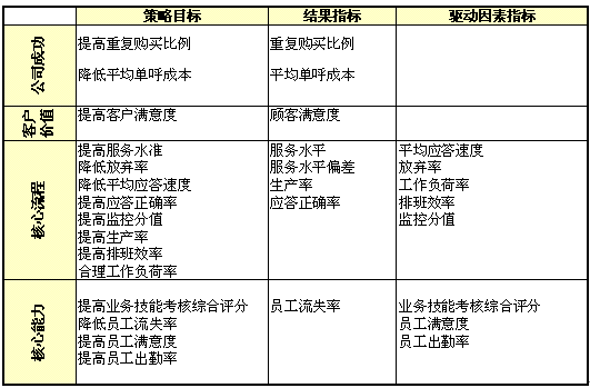1)公司成功;2)客戶價值;3)核心流程;4)核心能力;成為呼叫中心全程全網(wǎng)考核衡量的四大維度,實際反映了呼叫中心運(yùn)營管理中成本、客戶、內(nèi)部流程及呼叫中心的學(xué)習(xí)與成長的四個至關(guān)重要的領(lǐng)域,是實現(xiàn)公司遠(yuǎn)景規(guī)劃與使命的營運(yùn)管理核心。