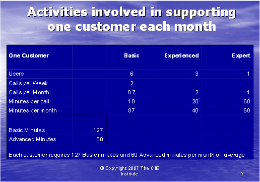 圖表1為我們提供了重要的信息,有助于我們計(jì)算一般的客戶在基礎(chǔ)和高級(jí)兩種技術(shù)支持中所需的技術(shù)支持的通話時(shí)長。我們需要區(qū)分這兩種技術(shù)支持,因?yàn)樘峁└呒?jí)技術(shù)支持的座席的月薪是2000美元,比提供基礎(chǔ)技術(shù)支持,月薪為1000美元的座席每月所花的成本要高。那么,面臨有經(jīng)驗(yàn)的客戶使用者時(shí)該怎么做呢?因?yàn)橹挥袑I(yè)客戶使用者才能要求高級(jí)座席支持,所以他們的需要似乎可以由與初級(jí)客戶使用者打交道的基礎(chǔ)座席處理。