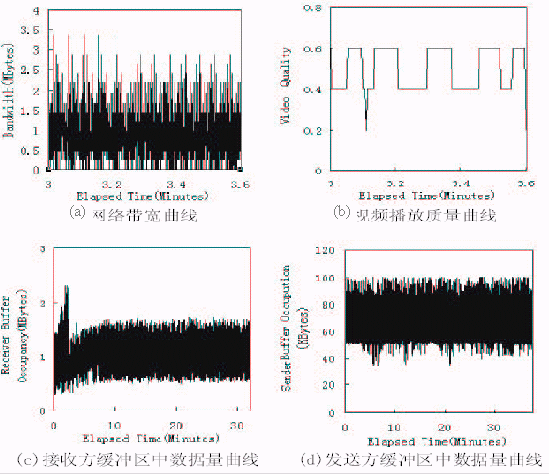 圖3給出了在劇烈的帶寬變化情況下,應(yīng)用該技術(shù)的視頻點(diǎn)播系統(tǒng)所達(dá)到的性能。在圖3中,(a)表示所使用的帶寬情況;(b)表示客戶端得到的視頻播放質(zhì)量;(c)和(d)分別表示在播放過程中接收緩沖區(qū)和發(fā)送緩沖區(qū)中的數(shù)據(jù)量情況。對(duì)比圖3(a)(b)可以看出,在網(wǎng)絡(luò)帶寬劇烈變化的情況下,視頻播放質(zhì)量的變化很平緩。由圖3(c)知,接收方緩沖區(qū)沒有發(fā)生上溢或下溢,這表明客戶始終能享受到連續(xù)的視頻播放,沒有出現(xiàn)播放卡殼;也沒有出現(xiàn)因?yàn)榫彌_區(qū)上溢而丟失從網(wǎng)絡(luò)傳過來的數(shù)據(jù)。圖3(d)則表明發(fā)送緩沖區(qū)始終在80k字節(jié)左右,沒有發(fā)生下溢,說明數(shù)據(jù)發(fā)送模塊始終有數(shù)據(jù)可發(fā),即網(wǎng)絡(luò)帶寬得到了充分利用。