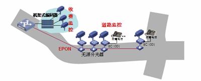 道路沿線監(jiān)控:采用EPON組網(wǎng),路況監(jiān)控球機(jī)接入前端編碼器,多個(gè)編碼器通過(guò)一根EPON光纖接入到中心交換機(jī)上,布線方便節(jié)省光纖資源。編碼器內(nèi)置交換機(jī)功能可以接入IP報(bào)警電話方便公路報(bào)警。還可以將支持IP接口的可變信號(hào)板和氣象站直接接入編碼器交換機(jī)端口,實(shí)現(xiàn)一網(wǎng)多用,降低整體網(wǎng)絡(luò)成本。