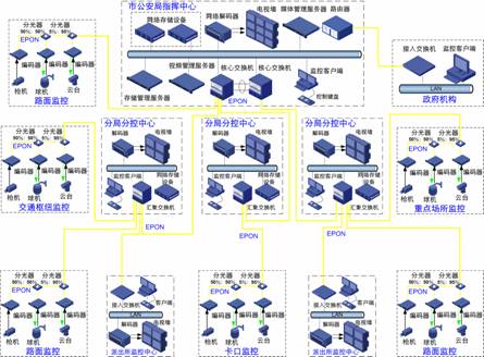 一般說來,城市監(jiān)控系統(tǒng)的網(wǎng)絡(luò)承載平臺要求建設(shè)專網(wǎng)或者VPN網(wǎng)絡(luò)。對于光纖資源較為豐富的城區(qū),可以使用數(shù)字SFP光纖接入,一個前端攝像頭對應(yīng)一條光纖;在光纖資源較少的區(qū)域,可以使用EPON(無源光網(wǎng)絡(luò))技術(shù),一芯光纖上可以同時接入多個前端攝像頭,大量節(jié)約了光纖資源和光纖租用成本;對于較為復(fù)雜的環(huán)境,不適合進行布線,可以采用無線接入的方式,降低施工成本。