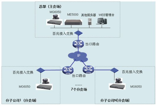 集團總部主會場和各個分會場各部署一臺H3C公司的MG6050多媒體網關,同時支持H.323和SIP協議,支持H.263/H.264編碼技術和4CIF高清晰圖像分辨率,最高可以提供2M會議帶寬。集團總部主會場和各個分會場推薦使用Sony
