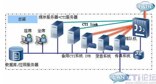 北京為總部中心,將部署CTI服務(wù)器、IVR服務(wù)器、錄音系統(tǒng)、傳真系統(tǒng)、文件服務(wù)器及相關(guān)業(yè)務(wù)數(shù)據(jù)庫(kù)服務(wù)器,為各個(gè)營(yíng)業(yè)網(wǎng)點(diǎn)提供業(yè)務(wù)支撐?偛繉(duì)整個(gè)網(wǎng)絡(luò)進(jìn)行管理,包括平臺(tái)配置、業(yè)務(wù)管理、數(shù)據(jù)管理、人員調(diào)度等。在總部CTI系統(tǒng)我們采用主備模式,確保了在出現(xiàn)網(wǎng)絡(luò)故障主CTI系統(tǒng)無(wú)法提供服務(wù)情況下,備用CTI系統(tǒng)將接替主CTI系統(tǒng)工作,確保了整個(gè)系統(tǒng)的正常工作。硬件平臺(tái)方面,UAP我們采用了雙主控板雙電源供電工作模式,這對(duì)系統(tǒng)長(zhǎng)期穩(wěn)定工作提供了保障?偛客瑫r(shí)也部署北京農(nóng)村商業(yè)銀行300個(gè)坐席人員,這些坐席人員可以按照業(yè)務(wù)進(jìn)行區(qū)分,大部分坐席精通一般的業(yè)務(wù),為普通客戶提供優(yōu)質(zhì)服務(wù),少部分坐席(專業(yè)坐席)人員為高價(jià)值客戶提供高級(jí)的專業(yè)的優(yōu)質(zhì)服務(wù),在普通坐席比較忙時(shí),專業(yè)坐席可以為普通用戶提供服務(wù),坐席中,還有極少部分可以充當(dāng)坐席管理員角色,他們也可以監(jiān)控各個(gè)分中心坐席服務(wù)的質(zhì)量,對(duì)有問(wèn)題服務(wù)可以實(shí)現(xiàn)監(jiān)聽(tīng)、監(jiān)察、和強(qiáng)拆功能,及時(shí)的保證服務(wù)質(zhì)量,維護(hù)了企業(yè)形象。