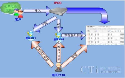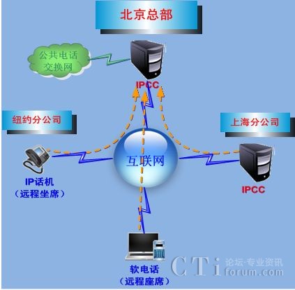 客戶采用IPCC-100型的IPCC系統(tǒng)組建一套分布式呼叫中心系統(tǒng)。它不僅實現(xiàn)呼叫中心功能,又完全取代傳統(tǒng)PBX作為核心的通信系統(tǒng)?蛻艨偛咳萘繛50門分機,30門用于呼叫中心坐席,20門用于辦公線路用。另有2個分支機構(gòu)分別配置一臺IX-50和IE-62,作為分公司的電話交換設(shè)備。通過互聯(lián)網(wǎng)與總部的IPCC點對點對接,實現(xiàn)內(nèi)部互通免費。