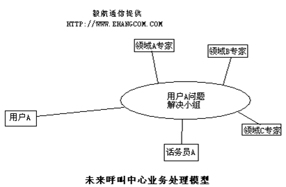 在未來(lái)呼叫中心里面,話務(wù)員的技能主要就是協(xié)調(diào)專家組和用戶的需求間的關(guān)系,此時(shí)話務(wù)員不需要很多技能,她變成一個(gè)小組工作組織者。而一個(gè)個(gè)領(lǐng)域?qū)<揖褪窃拕?wù)員的助手,她根據(jù)對(duì)用戶業(yè)務(wù)處理的情況,實(shí)時(shí)邀請(qǐng)相應(yīng)的專家加入問(wèn)題解決小組。領(lǐng)域?qū)<野葱柽M(jìn)入和退出問(wèn)題解決小組,此時(shí)客戶感覺始終如一的有個(gè)話務(wù)員在幫忙處理他的問(wèn)題,而不是象現(xiàn)在的呼叫中心那樣,被踢皮球,每轉(zhuǎn)接一次,就得重復(fù)很多提供過(guò)的資料,這樣費(fèi)時(shí)重復(fù),還容易引起用戶怨言;甚至在被轉(zhuǎn)接的過(guò)程掉線了。在這個(gè)未來(lái)模型中,話務(wù)員的問(wèn)題處理技能不是重要的,重要的是她的組織協(xié)調(diào)能力,因而對(duì)話務(wù)員的大量專業(yè)知識(shí)培訓(xùn)就變得不在必要,話務(wù)員變成了任何呼叫中心都通用的了,不再和企業(yè)業(yè)務(wù)緊密相關(guān)。減少無(wú)關(guān)要求,推動(dòng)整個(gè)呼叫中心行業(yè)進(jìn)一步分工協(xié)作,整個(gè)呼叫中心服務(wù)成本也能急劇降下來(lái),促使整個(gè)產(chǎn)業(yè)健康有序發(fā)展。