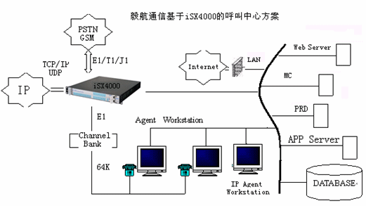 相對(duì)于現(xiàn)在的兩種主流呼叫中心方案,毅航通信基于iSX4000呼叫中心解決方案直接整合了Internet的接入。傳統(tǒng)由IVR完成的操作也可以通過(guò)Web頁(yè)面上的流程實(shí)現(xiàn),這樣用戶通過(guò)下拉菜單、簡(jiǎn)單填寫、點(diǎn)擊按鈕等操作完成客戶識(shí)別、業(yè)務(wù)識(shí)別等操作,這些流程完成后,通過(guò)VoIP對(duì)呼叫中心呼入,由呼叫中心對(duì)呼入進(jìn)行受理,再按照相應(yīng)的原則分配到座席,座席再作相應(yīng)的應(yīng)答和處理,從而為客戶提供了一個(gè)通過(guò)Web站點(diǎn)直接進(jìn)入呼叫中心的途徑,把Internet所具有的豐富信息資源和強(qiáng)大的功能賦予呼叫中心,它向客戶提供一個(gè)可訪問(wèn)的Web站點(diǎn),使得呼叫中心從“撥叫到交談(Dial to Talk)”發(fā)展到“點(diǎn)擊到交談(Click to Talk)”,通過(guò)Internet可以提供IP電話語(yǔ)音呼叫、Call Back、IP傳真、IM、E-mail等功能,擴(kuò)展了通信渠道,一方面用戶可以實(shí)現(xiàn)免費(fèi)接入到呼叫中心,另一方面企業(yè)能夠向更多的客戶提供優(yōu)質(zhì)、方便的服務(wù)資源,而且由于這些資源的價(jià)格相對(duì)傳統(tǒng)通信便宜,使企業(yè)為客戶提供全國(guó)、乃至于全球服務(wù)成為可能,提高了企業(yè)客戶服務(wù)水平,增強(qiáng)了企業(yè)競(jìng)爭(zhēng)力。毅航通信統(tǒng)一呼叫中心解決方案系統(tǒng)結(jié)構(gòu)如圖所示: