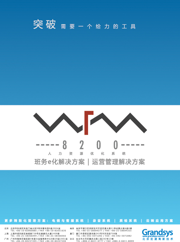 Grandsys 有最堅強的設計研發(fā)團隊,以16年豐富的行業(yè)知識為基礎,發(fā)展自有品牌應用軟件與專業(yè)服務事業(yè),盛大推出LOG8000KS錄音與關鍵詞辨識分析系統(tǒng)、QMS8100KS質檢與關鍵詞辨識分析系統(tǒng)、WFM8200人力資源優(yōu)化管理系統(tǒng)、和eVoice8300電話營銷與客戶服務系統(tǒng),為企業(yè)打造完整的呼叫中心管理平臺。