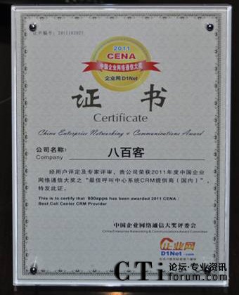 CTI論壇(ctiforum)10月31日消息(記者 張潔):10月19日,2011 秋季CENCE 中國企業(yè)網(wǎng)絡(luò)通信大會暨云計(jì)算高峰論壇在上海展覽中心盛大舉行。國內(nèi)首家SaaS廠商八百客憑借連續(xù)在云計(jì)算領(lǐng)域的成熟技術(shù)以及在市場中的廣泛認(rèn)可度,獲得“最佳呼叫中心系統(tǒng)CRM提供商”大獎。