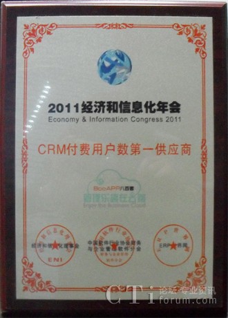 作為全球企業(yè)管理軟件領(lǐng)跑者,八百客參加了此次會(huì)議,并就IT業(yè)戰(zhàn)略性發(fā)展、工業(yè)轉(zhuǎn)型升級(jí)等問(wèn)題和與會(huì)企業(yè)家進(jìn)行了深入探討,集中、深刻闡釋產(chǎn)業(yè)精髓,洞悉和把握未來(lái)發(fā)展方向,尋求最佳的信息化成長(zhǎng)模式。年會(huì)期間的招待晚宴穿插各類(lèi)年度大獎(jiǎng)的頒獎(jiǎng)典禮,讓與會(huì)的政界、學(xué)界、商界等各路貴賓充分交流信息,建立友誼,為達(dá)成長(zhǎng)期合作奠定良好的基礎(chǔ);诎税倏驮趪(guó)內(nèi)CRM領(lǐng)域的優(yōu)秀表現(xiàn),本次年會(huì)特別授予了八百客“CRM付費(fèi)用戶數(shù)第一供應(yīng)商”的大獎(jiǎng)。