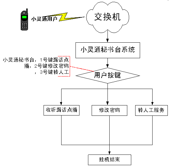 當(dāng)主叫用戶撥打被叫小靈通用戶,而被叫小靈通用戶處于不可達(dá)(關(guān)機(jī)、忙、不在服務(wù)區(qū))狀態(tài)時(shí),該呼叫自動(dòng)轉(zhuǎn)入轉(zhuǎn)到小靈通秘書臺(tái)系統(tǒng)后,用戶選擇1號(hào)鍵,系統(tǒng)會(huì)提示主叫用戶給被叫留言,留言成功后,小靈通秘書臺(tái)系統(tǒng)會(huì)發(fā)送短信給被叫通知被叫有語(yǔ)音留言。