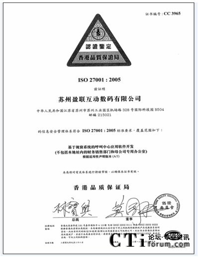 2009年9月28日,蘇州盈聯(lián)公司獲得了由國際權(quán)威認(rèn)證機(jī)構(gòu)香港品質(zhì)保證局頒發(fā)的ISO 27001:2005(信息安全管理體系ISMS)國際認(rèn)證證書,這標(biāo)志著蘇州盈聯(lián)公司繼2008年7月通過CMMI3級評估之后又一見證企業(yè)資質(zhì)與能力的重要里程碑。