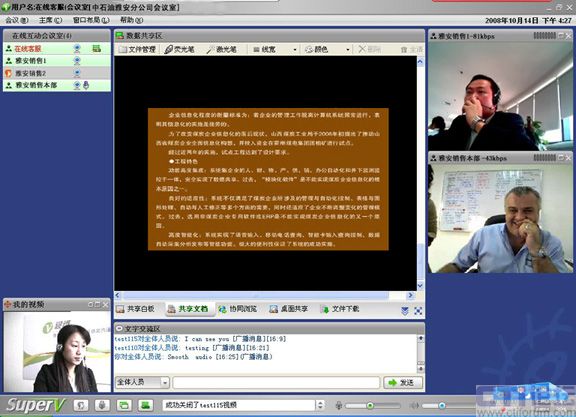 CTI論壇(ctiforum)05月19日消息: 自08年攜手視維Super-V視頻會(huì)議以來,中石油雅安分公司銷售部的日常工作會(huì)議高效及時(shí)地開展,尤其是在5.12四川大地震后,工作不但沒有中斷,而且足不出戶就可以給上級(jí)領(lǐng)導(dǎo)匯報(bào)工作,與同事交流營銷心得。而在以前,只能通過電話或者郵件,甚至長(zhǎng)途跋涉聚集到一個(gè)地方舉行會(huì)議,既浪費(fèi)時(shí)間又增加營銷成本。這是繼中國重汽、新加坡協(xié)美集團(tuán)等跨國集團(tuán)公司倡導(dǎo)信息時(shí)代新營銷主義,實(shí)現(xiàn)高效運(yùn)營的又一典型案例應(yīng)用。
