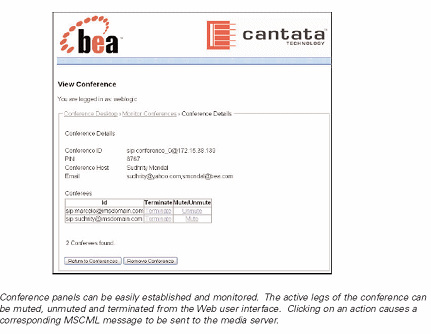 在上述應用中,一用戶建立了一個多媒體會議會話。該會議的進行一如我們平常所熟悉的基于運營商的語音會議系統(tǒng)的商務會議。不同的是,它使用了基于Web的圖形交互, 使得用戶可以建立會議時間以及受邀請的參與人的列表,此外, 該應用還發(fā)出了一封含有該會議相關的聯(lián)絡信息的電子郵件。并且,它還充分利用了Cantata SnowShore 媒體服務器的高級多媒體功能為會議參與人提供豐富的多媒體體驗。