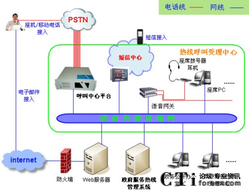 - 公民座機(jī)和移動電話通過當(dāng)?shù)仉娦诺腜STN網(wǎng)絡(luò)接入呼叫中心平臺,然后進(jìn)入熱線系統(tǒng);