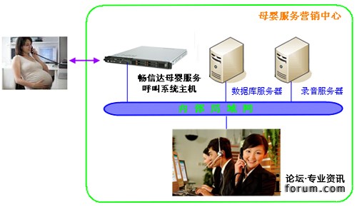 暢信達(dá)母嬰服務(wù)呼叫系統(tǒng)是以母嬰服務(wù)呼叫系統(tǒng)主機(jī)為呼叫交換和業(yè)務(wù)受理平臺,選配數(shù)據(jù)庫服務(wù)器和錄音服務(wù)器,采用人工座席發(fā)起呼叫并接聽來電,系統(tǒng)架構(gòu)圖如下: