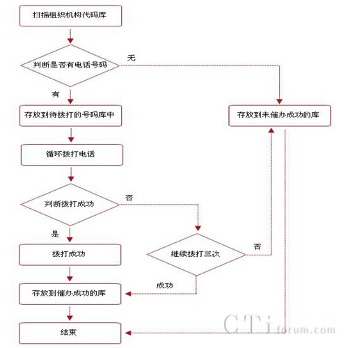 催辦業(yè)務負責完成語音提示。系統(tǒng)自動掃描組織機構代碼庫,查詢當日需要年檢的組織機構代碼信息,對沒有電話號碼的存入到未催辦的組織機構代碼庫中,有電話號碼的存入到待催辦的電話號碼庫中,并根據(jù)設置的時間撥打手機號碼,對于語音提示成功的,存放到相應的庫中。催辦業(yè)務后臺功能包括: