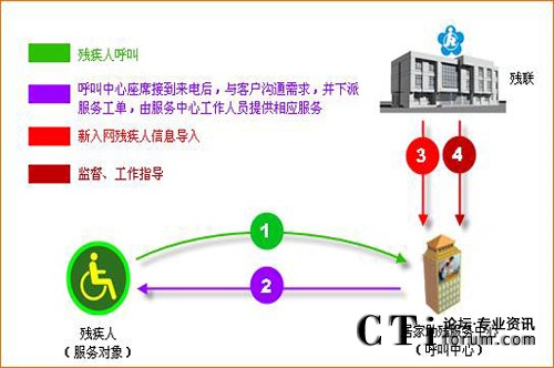根據(jù)服務轄區(qū)內殘疾人的情況,殘聯(lián)將需要提供居家服務的對象提供給服務中心,服務中心將殘疾人檔案信息上傳于系統(tǒng)內。當殘疾人通過手機或固定電話撥打“服務中心服務統(tǒng)一電話號碼”(或采用一鍵呼叫的話機呼叫“服務中心服務統(tǒng)一電話號碼”)時,服務中心的座席電腦上就會彈出殘疾人信息(包括:名字、地址、聯(lián)系電話、殘疾類別與等級、身份證號碼、殘疾證號、監(jiān)護人性姓名、監(jiān)護人電話等等)。具體流程如下: