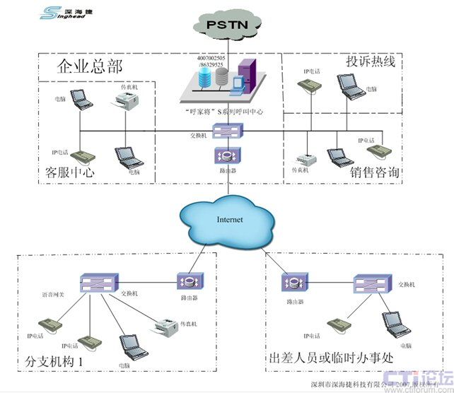 基于“呼家將”呼叫中心系統(tǒng)靈活的組網(wǎng)結(jié)構(gòu)以及強大的系統(tǒng)功能,其完全可以替代傳統(tǒng)的PBX系統(tǒng),洲際大酒店可以在公司總部建立中央呼叫中心系統(tǒng),其配置3條數(shù)字中繼線的接入能力,后續(xù)可以平滑擴充成4條數(shù)字中繼線接入。內(nèi)線為300部座機,全部使用模擬電話線和電話機,并且可以繼續(xù)平滑擴容,對于臨時辦公人員、出差人員以及外地辦事處,可以使用軟終端或者網(wǎng)關(guān)+普通電話的形式接入,其最大的優(yōu)勢是成本低,接入靈活。