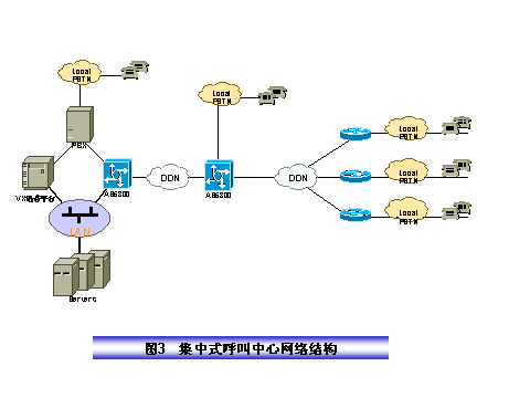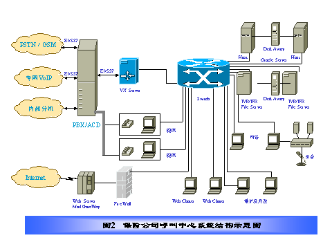 某保險(xiǎn)公司電話中心采取全國集中服務(wù)方式,其結(jié)構(gòu)如圖2所示,在電話呼叫中心集中管理所有人工語音坐席和電話中心運(yùn)行所需的所有業(yè)務(wù)數(shù)據(jù)、語音文件和硬件設(shè)備,服務(wù)全國。我們?cè)O(shè)計(jì)的方案具有如下特點(diǎn):