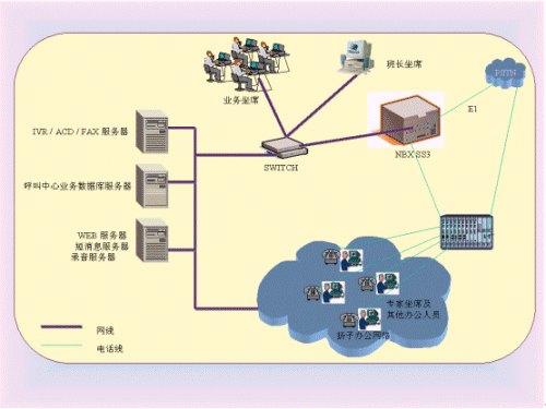 NBX SS3 網(wǎng)絡(luò)電話交換機作為基礎(chǔ)通信平臺,由北大方正電子技術(shù)有限公司在北京網(wǎng)音公司呼叫中心中間件進行集成開發(fā),建立CTI,ACD、IVR、FAX、TTS及其應(yīng)用服務(wù),集成現(xiàn)有的WEB、mail、短消息系統(tǒng),建立統(tǒng)一消息平臺,新建和利用各業(yè)務(wù)數(shù)據(jù)庫,設(shè)計業(yè)務(wù)坐席及客戶端軟件。